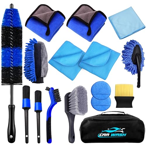 GUANJUNE 18Pcs Car Wash Cleaning Kit with Wash Mitt Sponge Towels, Tire Brush Tool Set, Interior Exterior Car Care Detailing Set for Car Motorcycle Bike Cleaning Wheels, Engine, Emblems, Air Vents