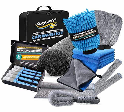 15pc All in 1 Car Cleaning and Washing Kit, XL Drying Towel Microfiber Cloths Interior Detailing Brushes Cleaning Gloves Motorbike Detailing Kit Wash Sponge & Wheel Cleaner Brush - Car Gifts for Men