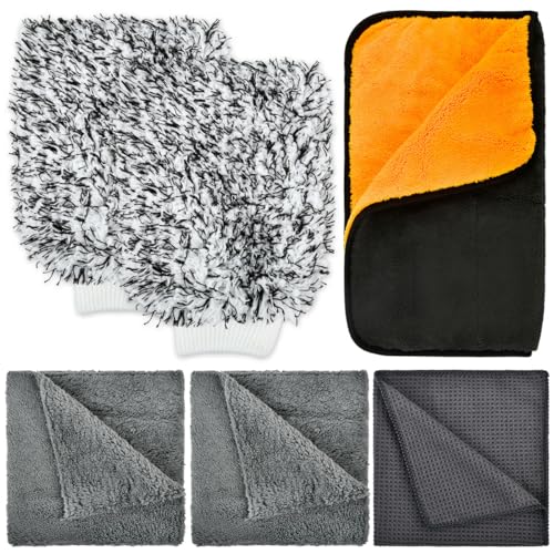 HUMOKI 6 Piece Car Washing Kit - Car Wash Mitt, Dual-Sided Microfibre Car Drying Cloth, Absorbent Car Drying Towel, Waffle Cloths - Car Cleaning Kit, for Interior Exterior Car Wash