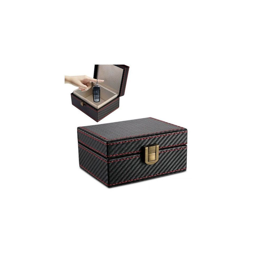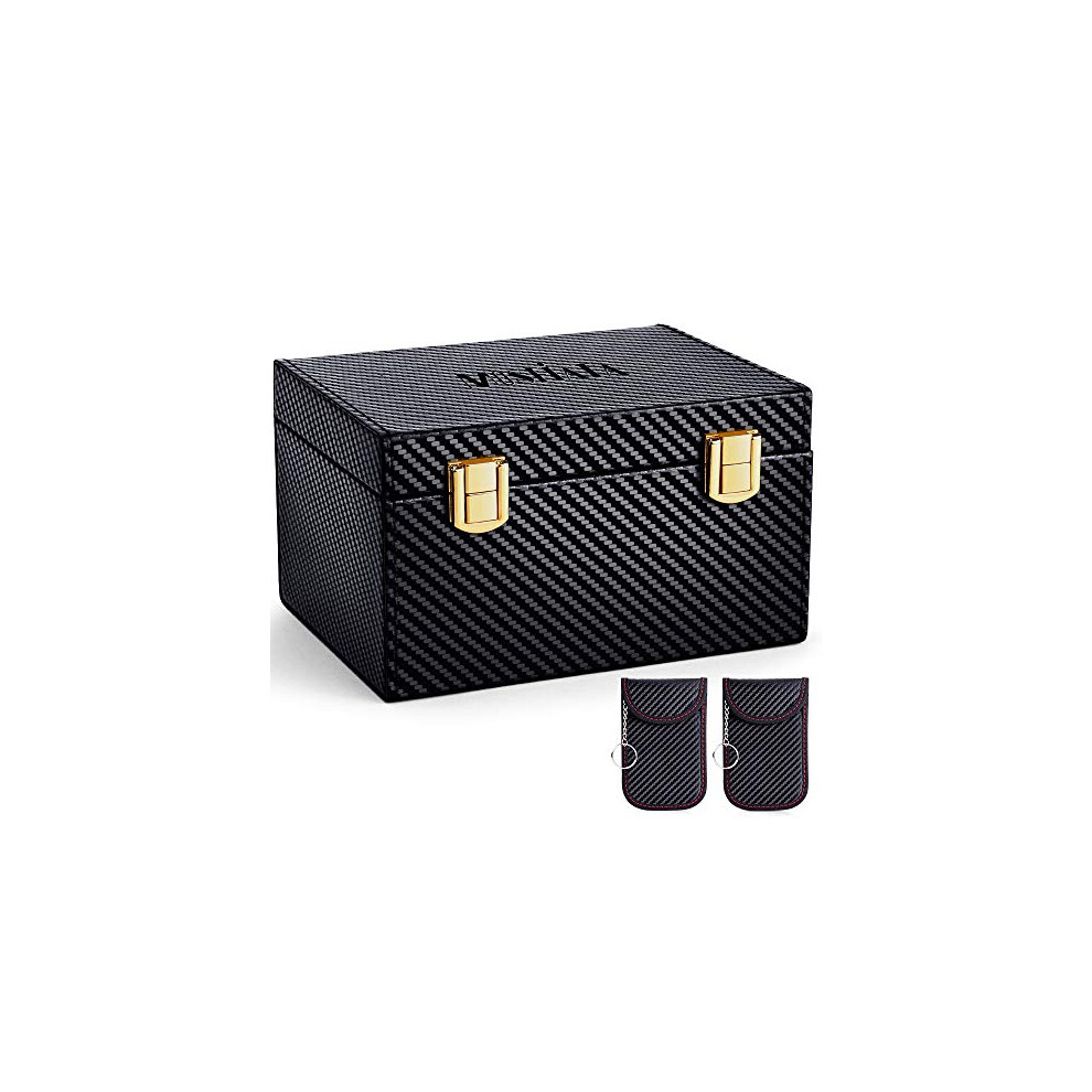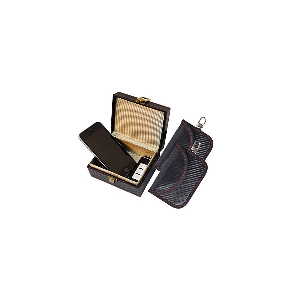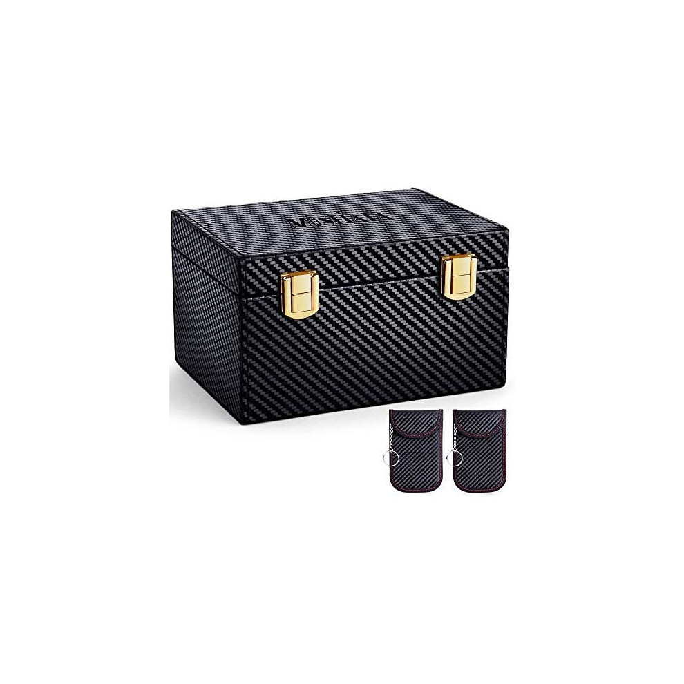 QIAOIDEA Faraday Box with 2 Carbon Fiber Key Pouches – RFID Signal Blocking Box for Car Keys & Phones, Anti-Theft PU Leather Case for Digital Privacy Protection – Key Fob Signal Blocker Set
