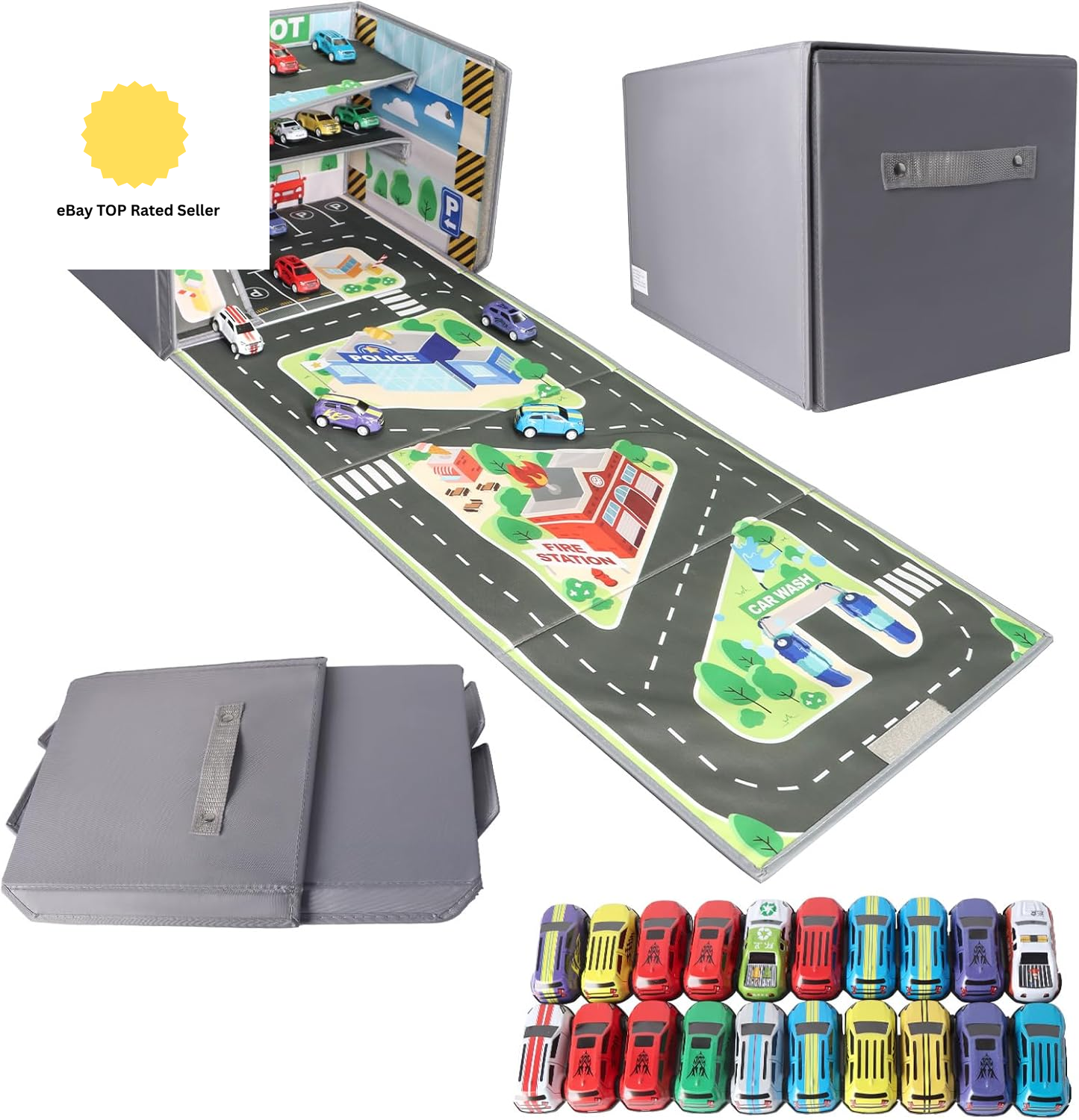 Toy Car Storage Box Play Mat with 20 Cars, Kids Storage Boxes with Handles, Foldable and Portable Toy Car Mats with Speed Roads for Boys Girls (Grey-Speed Road)
