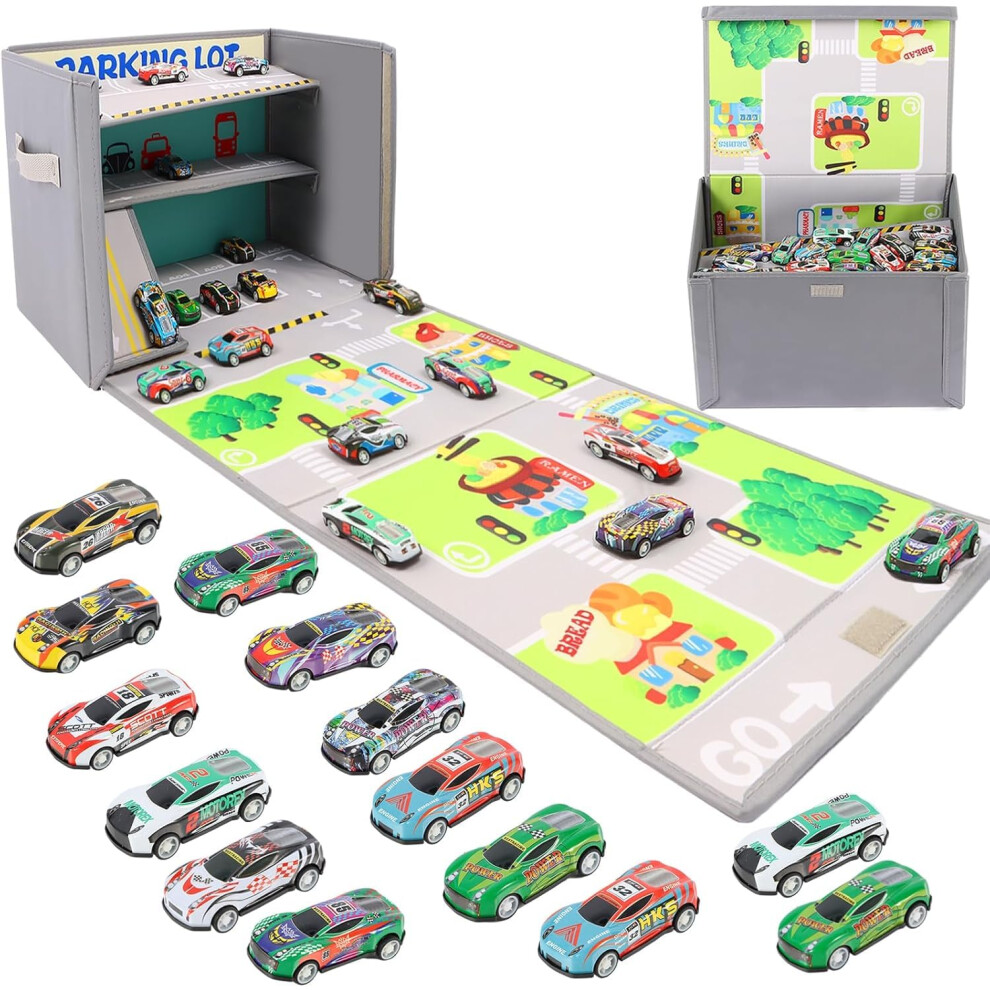 Toy Car Storage Box Play Mat with 20 Cars, Kids Storage Boxes with Handles, Foldable and Portable Toy Car Mats with Speed Roads for Boys Girls (Grey-Speed Road)
