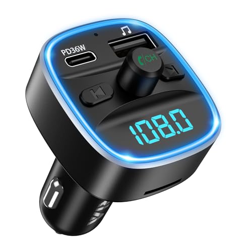 ORIA Bluetooth 5.3 Car Adapter, Car Audio FM Transmitters with 36W PD Fast Charging, Blue LED Backlit, Handsfree Calling, Wireless Car Radio Adapter Support TF Card & USB Disk, Car Music Adapter