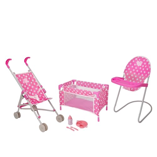 HTI Nursey Playset | 7 Piece Nursery Playset Doll Highchair, Crib, Doll Car Seat & Reusable Cutlery Set | Prams, Pushchairs and Dolls Accessories for Boys & Girls Age 3+