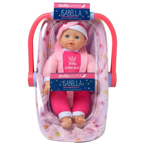 Dolls World from Peterkin | Isabella Doll & Car Set | 30cm (12") soft bodied doll with sleeping eyes, complete with rocking baby car seat with adjustable carry handle | Dolls & Accessories | Ages 18m+