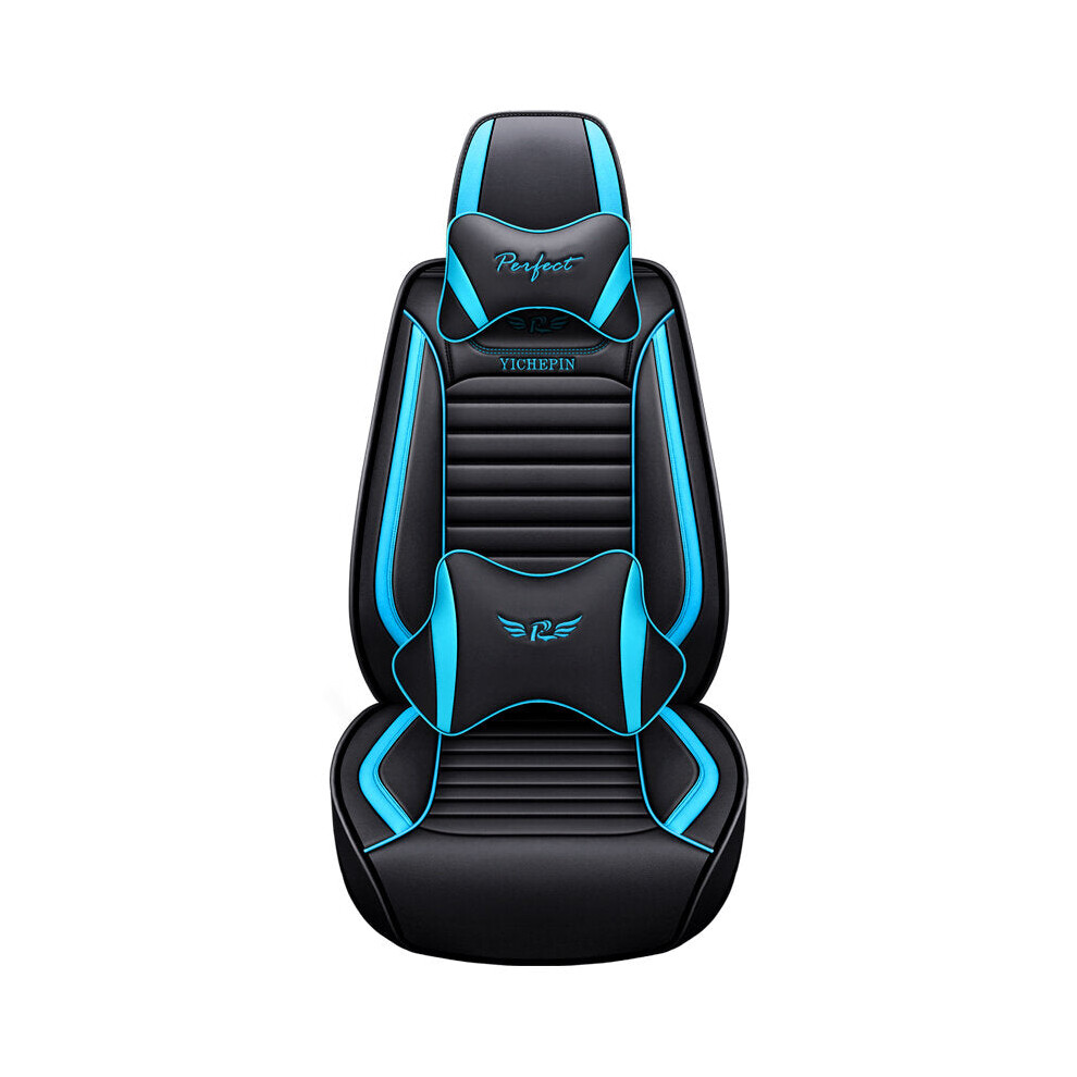 (Black blue) PU Car Seat Cover Cushions with Headrest Automobile Universal Protective Mat Cushion Front and Rear Seat Cover for Car