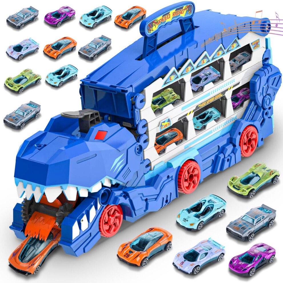 Dioju Dinosaur Car Transporter Toy with Race Cars Monster Truck Toys f