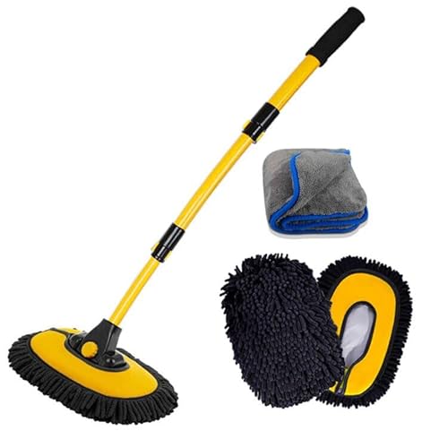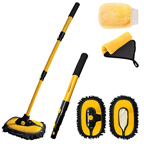 YeewayVeh 5PCS Car Wash Brush with Long Handle, 15° Curved Car Wash Mop with 2 Chenille Mop Heads, Car Washing Brush Kit with Car Wash Mitt and Towel for RV Truck Camper Cleaning, Yellow