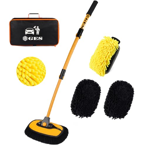 GES 43" Car Wash Brush,15° Curved Car Cleaning Brush with Extendable Extra-Long Handles for Washing Car Caravan Van Truck Soft Chenille Head Duster Cleaning Kit (Black and Yellow)