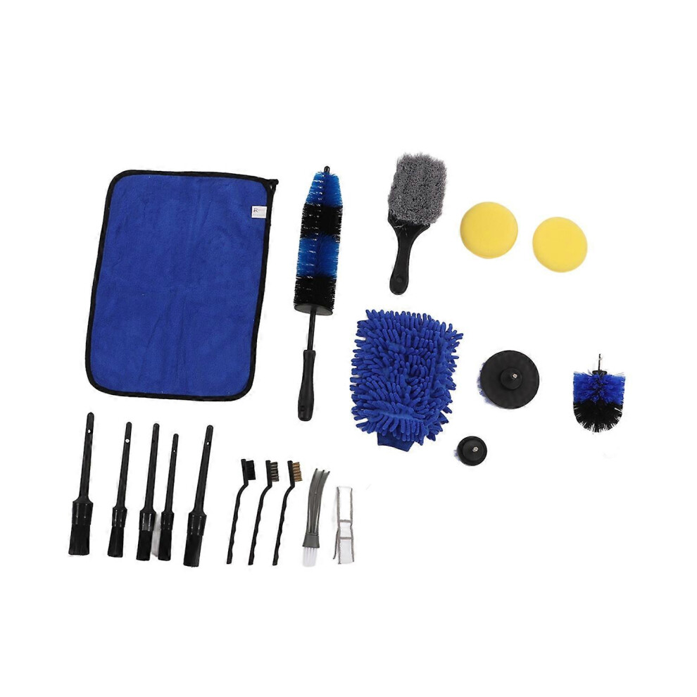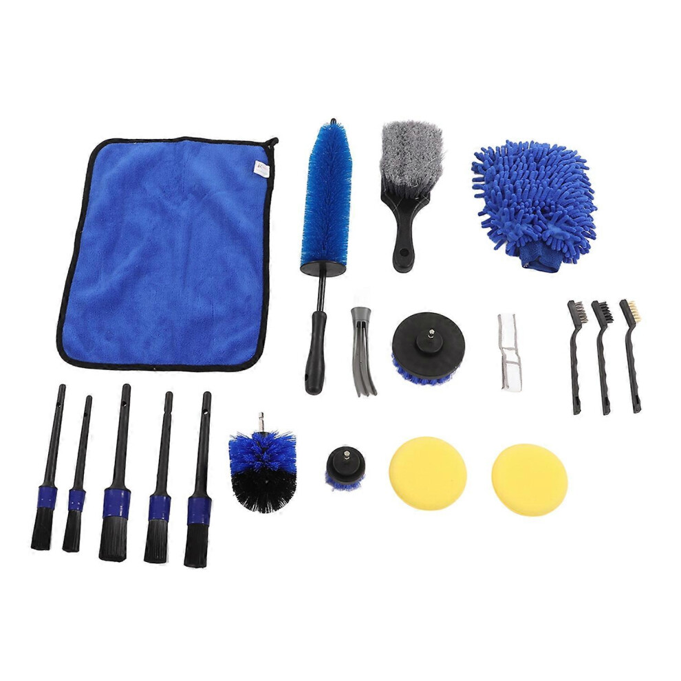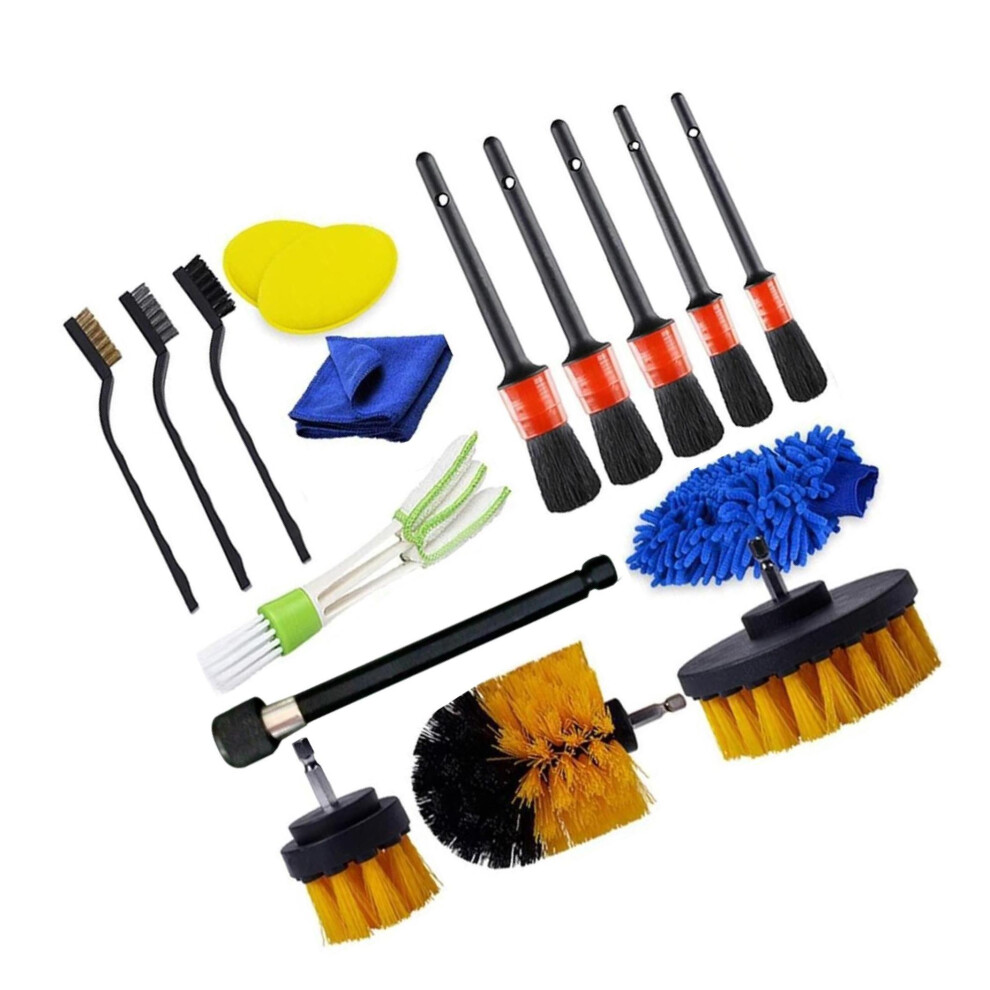(As show, One size) 18pcs Car Detailing Brush Kit Tire Drill Brushes Wash Mitt Towel Wax Pad Cleaning Tool for Wheel Exh