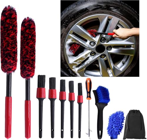 OBDKCAN Wheel Brush Kit 10PCS Car Wheel Cleaning Kit Detailing Brushes Car Wash Mitt Car Wash Cleaning Kit for Clean Rims, Spokes, Barrels & Tyres Emblems, Air Vents