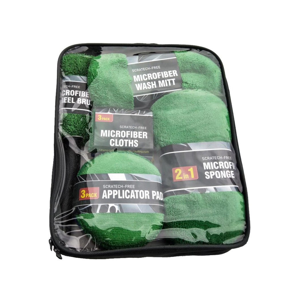 9pcs Car Wash Cleaning Kit Gloves, Towels, Rags, Applicator Pad, Sponges, Wheel Brushes Green