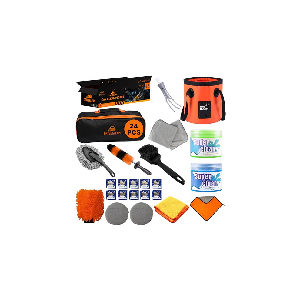 drivegleam 24 Pcs Car Cleaning Kit with Storage Bag, 12L Foldable Bucket, Detailing Brushes, Wash Mitts, Valeting Products- Interior Exterior Car Was