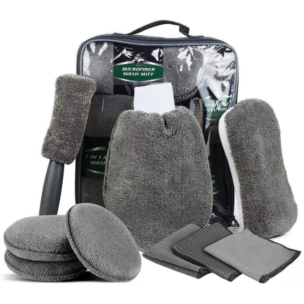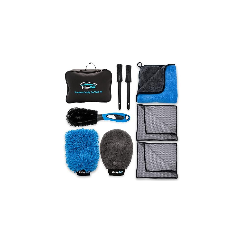 ShinyCar? UK: Premium 8Pcs Car Wash Tool Cleaning Kit With Bag: Microfibre Valet Washing Mitts, Exterior Drying Towel, Waffle Cloths, Alloy Wheel
