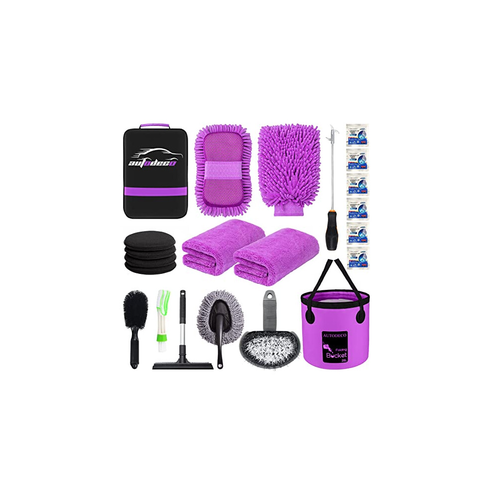 AUTODECO 22Pcs Car Wash Cleaning Tools Kit Car Detailing Set with Canvas Bag Purple Collapsible Bucket Wash Mitt Sponge Towels Tire Brush Window Scrap