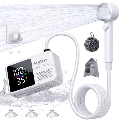 Mytrix Portable Shower for Camping, Powerful 10L/Min Water Flow, Rechargeable Shower Pump with Bath Sponge, 4 Spray Modes, IPX8 Waterproof, 7800mAh Battery, Ideal for Hiking, Travel, Car Wash, Pet