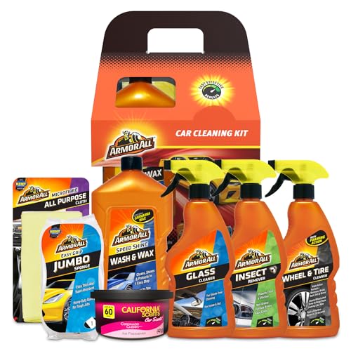 Armor All 7-Piece Car Cleaning Kit, Includes Glass Cleaner, Jumbo Sponge, Car Wash & Wax, California Scents Can Car Air Freshner, Wheel & Tyre Cleaner 500ml, Insect Remover and Microfibre Cloth