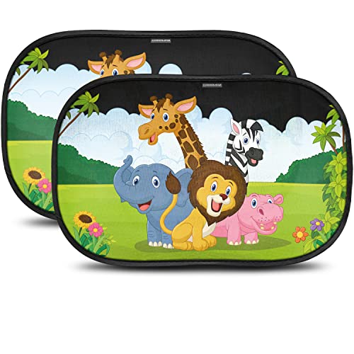 Car Window Shades for Baby with Certified UV Protection - Optimal Darkness with Suction Cups in Universal Size 51 x 31 cm - Safari Animals Design - Pack of 2