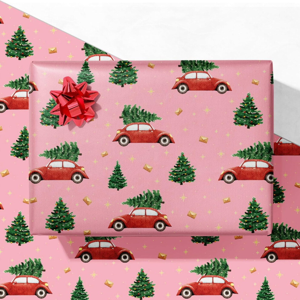 Red Car Christmas Wrapping Paper for Kids & Adults â Pink Holiday Gift Wrap with Trees & Cars, 4 Sheets (28x40"), Easy Storage