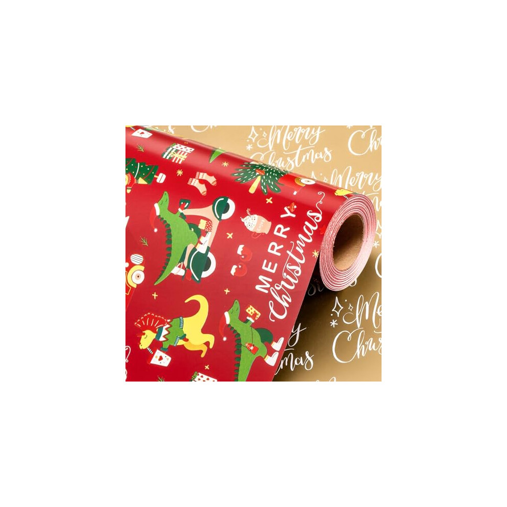 Wikadlik Red Christmas Wrapping Paper Roll - 43cm x 10m Cute Funny Dinosaur Tree Car