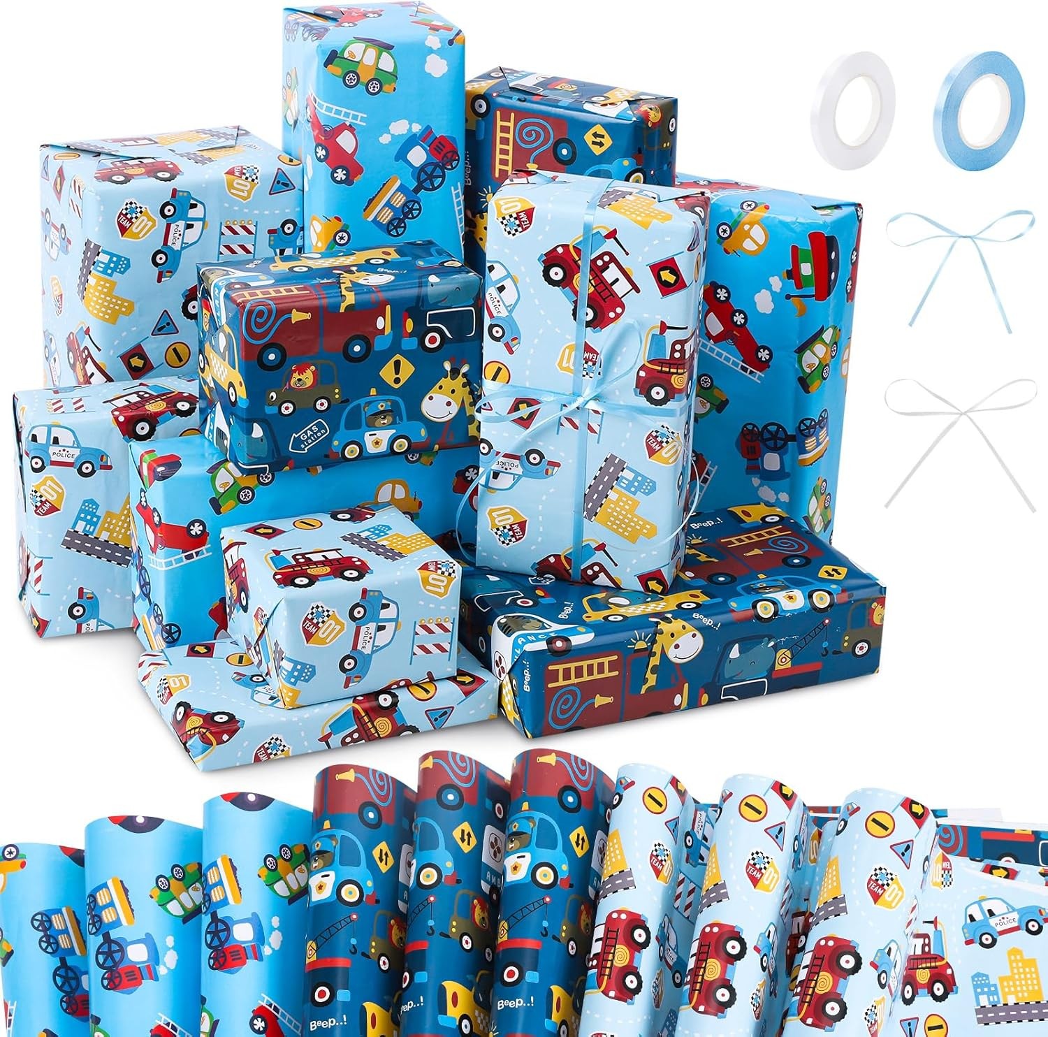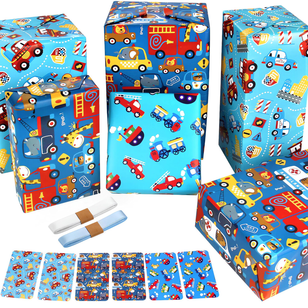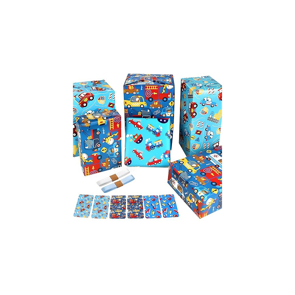 Wrapping Paper for Kids Boys Birthday Wrapping Paper Sheets with Police Car Fire Trucks Crane Ambulance Giraffe Elephant Gift Wrapping Paper Children