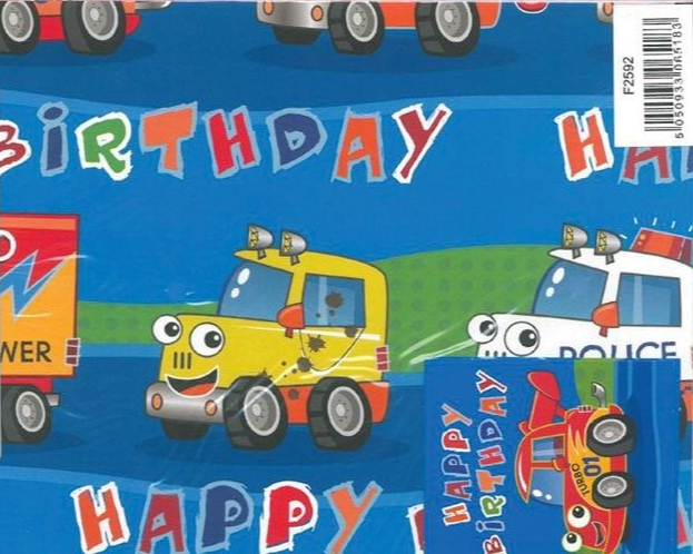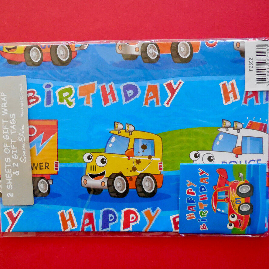 2 Sheets Of Birthday Wrapping Paper With 2 Gift Tags Wrap Boy Child Van Car