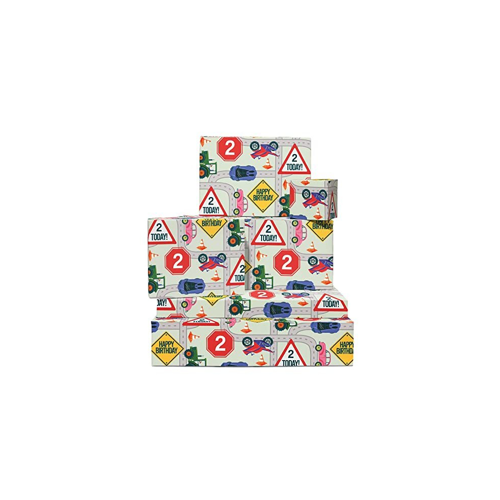 Kids Wrapping Paper - 6 Sheets of Gift Wrap with Tags - Age Two - 2nd Birthday - For Boys Son Grandson Toddler - Car Tractor Motorcycle - Cones Road