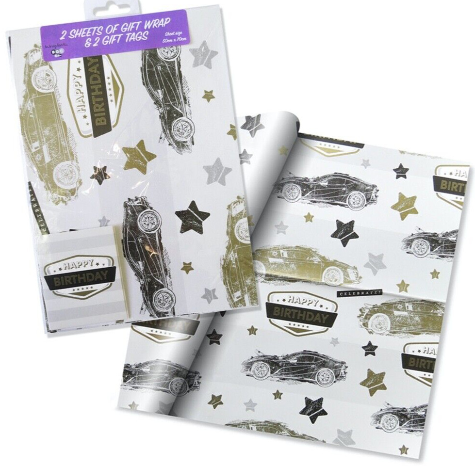 2 Sheets of Sports Racing Car Birthday Gift Set Wrap Wrapping Paper Tags