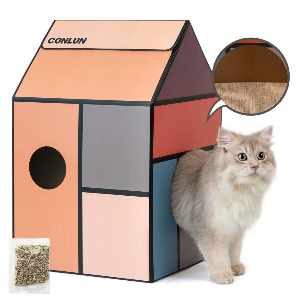 Conlun Cardboard Cat House with Scratching Board & Catnip, Cat Play Scratch House for Indoor Hideaway Furniture, Heavy Duty Sturdy Cardboard Scratcher, Easy to Assemble Birthday Gift, Medium