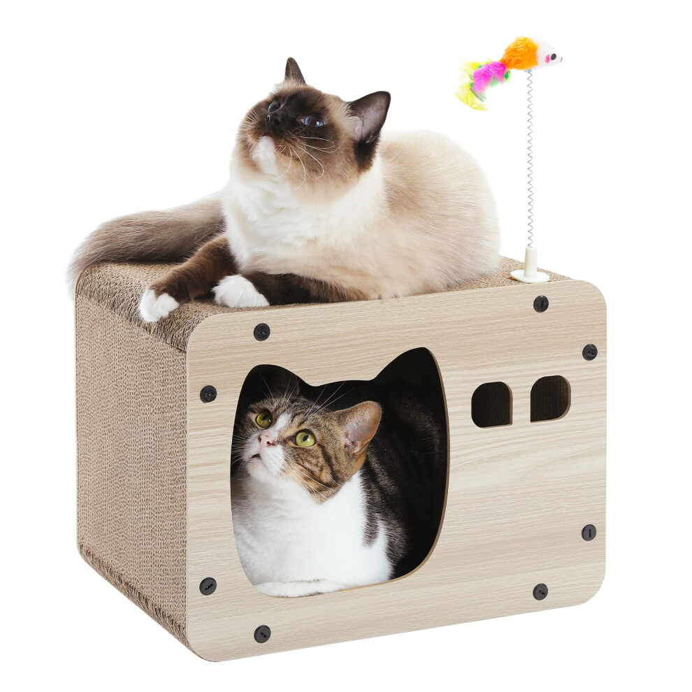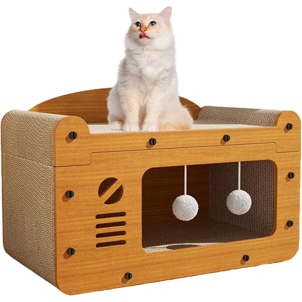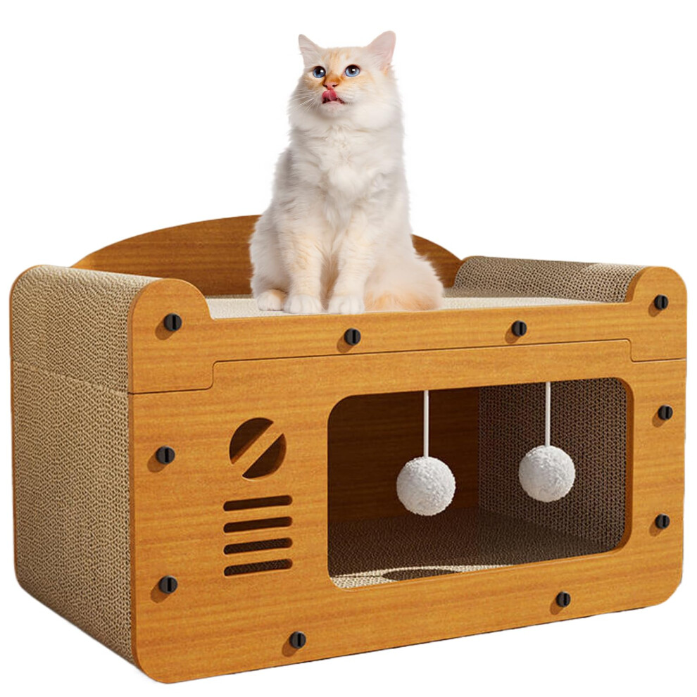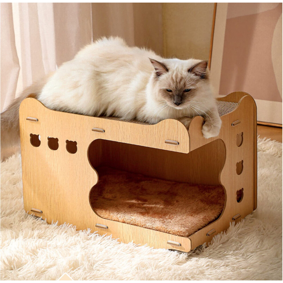Cardboard Cat House Scratcher with Fur Pad, Wooden Cat Scratchers for Indoor Cats with Corrugated Cardboard
