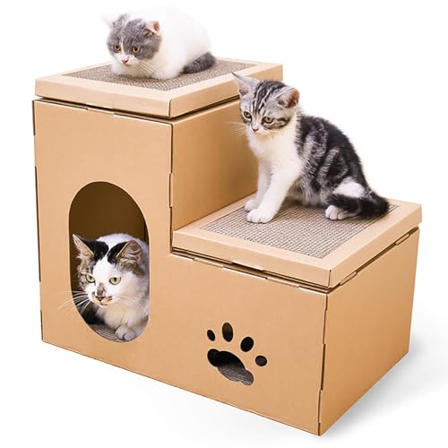 HIOVEL Cardboard Cat House, 2-Story Staircase Cat Box with Scratchering Board, Hideaway for Indoor Cats Rabbits Puppys Small Animals