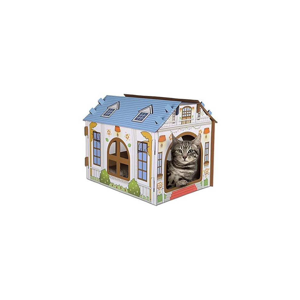 (Blue) Premium Corrugated Cardboard Cat House with Scratching Pad for