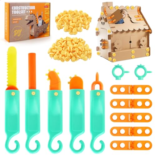 VVVMECYT Kids Cardboard Tool Kit- 338 PCS Cardboard Construction Toolbox – with Cardboard cutter, Screwdrivers, Punch holes, Screws, 90° connectors, Kids Building Set for Creative DIY Projects