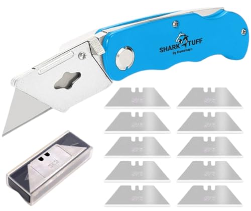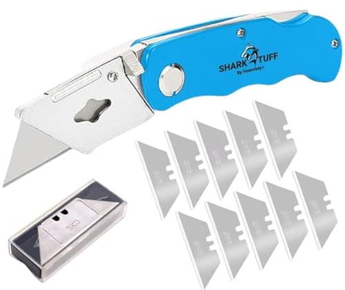 Shark-Tuff® Heavy Duty Folding Utility Knife with 10 Spare SK5 Blades | All Metal Sharp Craft Tradesman Camping Pocket Knife Cardboard Box Cutter with Belt Clip & Safety Lock UK Legal