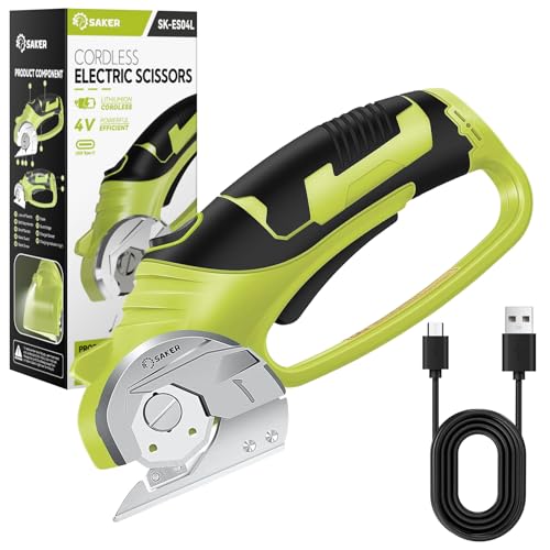 Saker Cordless Electric Scissors,4V Rechargeable Cardboard Box Cutter Fabric Scissor with Safety Lock & LED Light,Power Rotary Cutter for Leather Carpet Plastic Cutting (Cordless Scissor, Green)