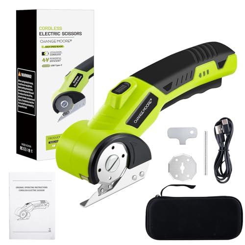 CHANGEMOORE 5V Cordless Electric Scissors for Cutting Fabric Cardboard, Replacement 1 Blade, LED Light & Safety Lock, Charger, Storage Box, Rotary Cardboard Cutter for Box, Plastic, Carpet A