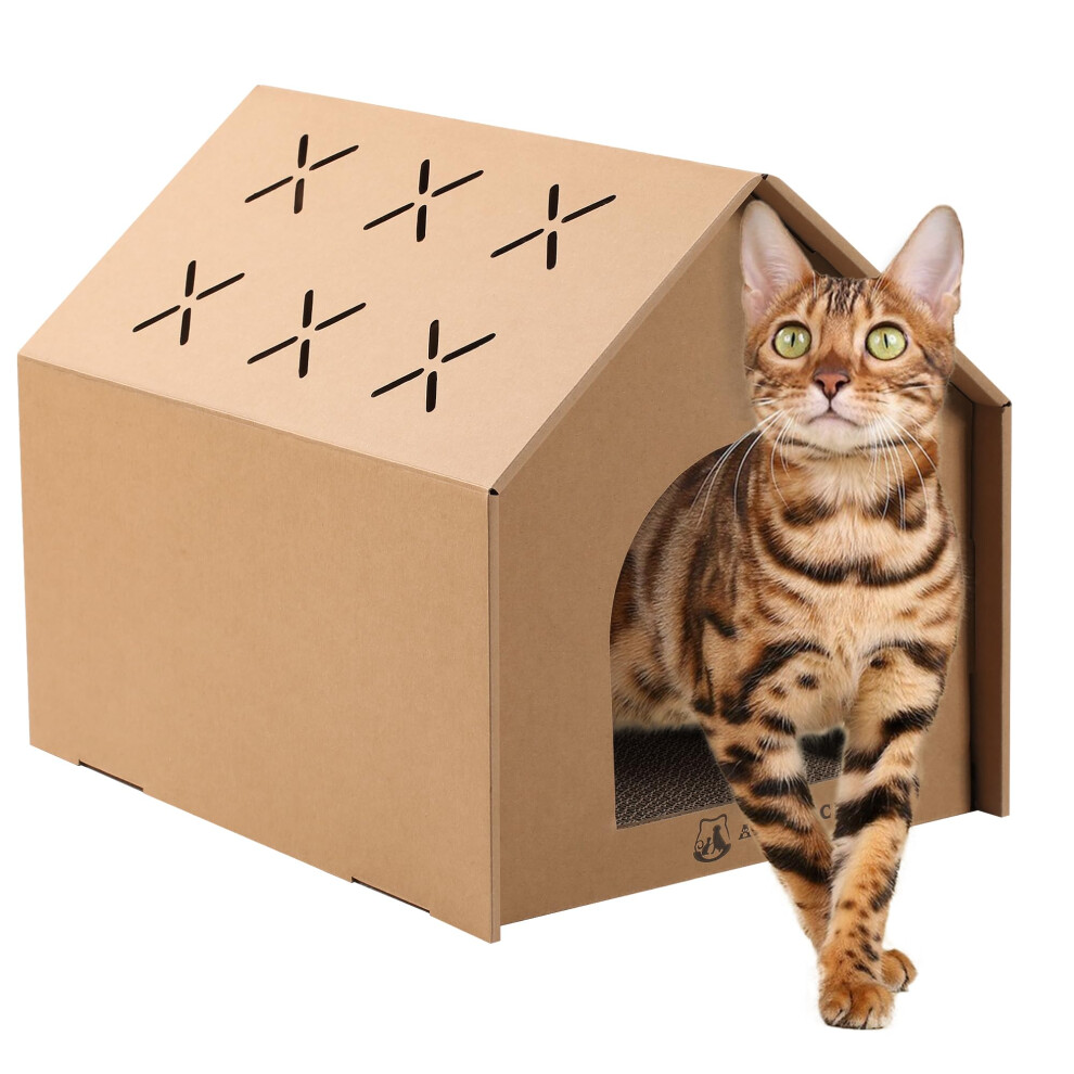 Aitmexcn Cardboard Cat House with Scratcher & Catnip - Indoor/Outdoor Hideout & Scratch Box for Cats, Rabbits, Small Pets, Eco-Friendly Playhouse