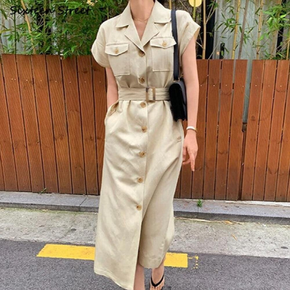 Vintage Cargo Dress Woman Single Breasted Short-sleeve Bodycon Dress Office Ladies Business Clothing Spring
