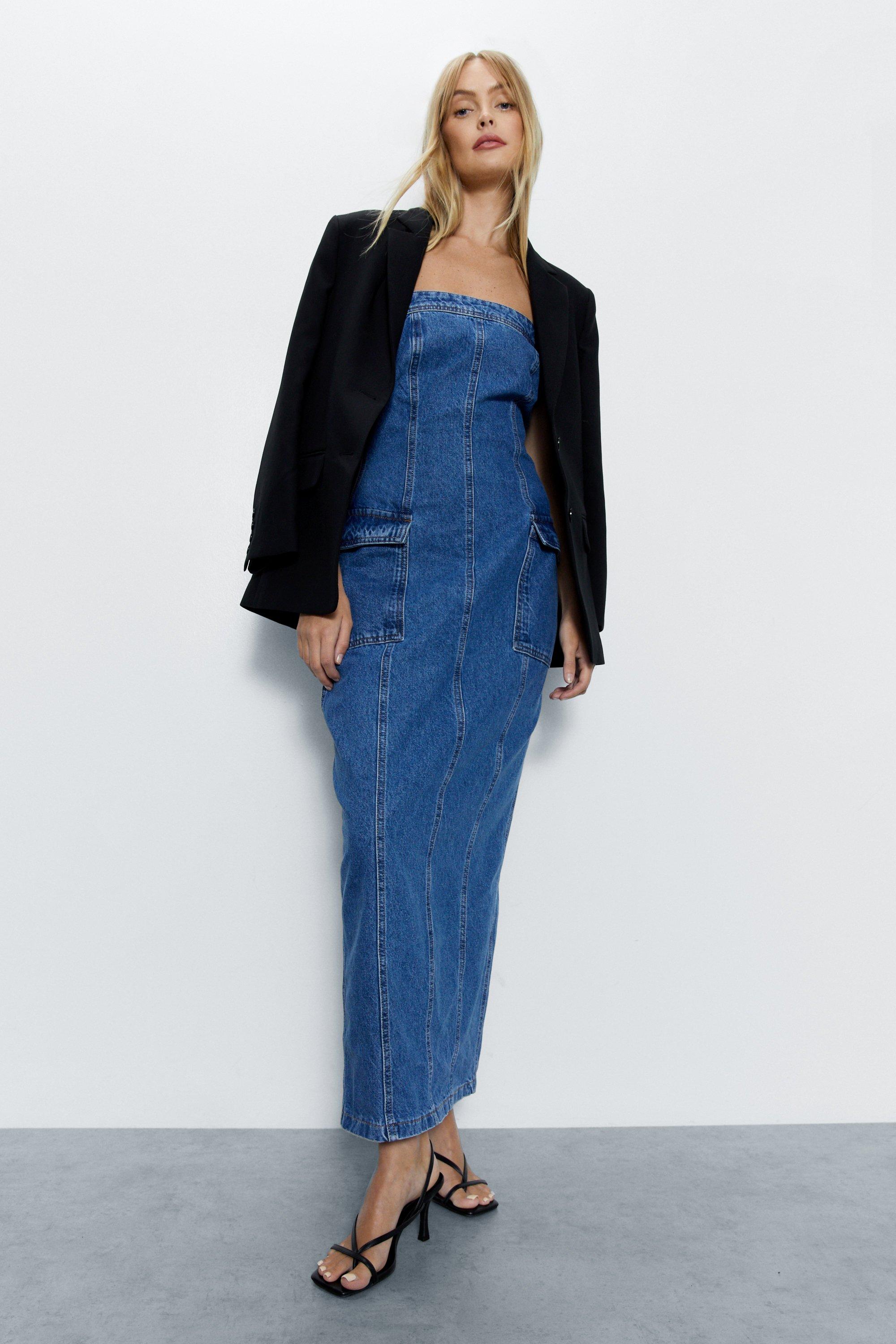 Bandeau Denim Cargo Maxi Dress