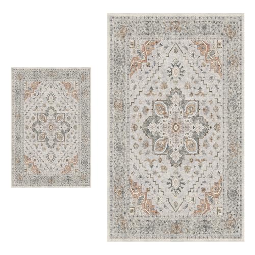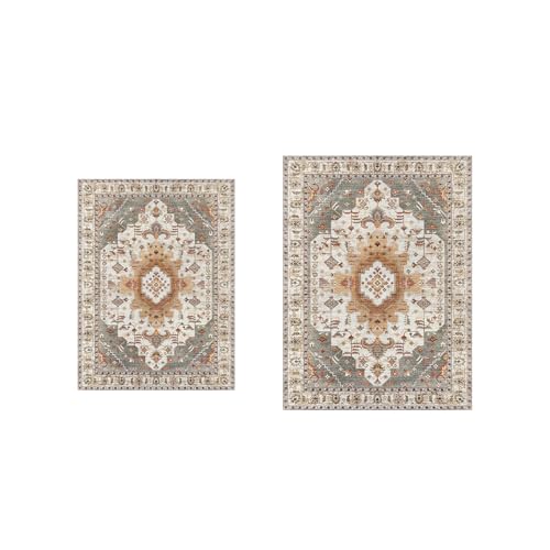 HQHYGM Tangsoo Vintage Rug 2x3 and 2x5 Washable Rug for Entryway, Runner Rug for Hallways, Non Slip Small Area Rug, Indoor Front Door Rug, Taupe Door Mat Carpet, Soft Low Pile Rugs for Entrance