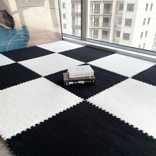 JNTFNE 12 and 24 Inch Interlocking Floor Mat with Edgings,12 Pcs Plush Floor Tiles,Puzzle Foam Playmat,Interlocking Foam Tiles,Carpet Rugs(Size:24x24x0.23 Inch,Color:Black+White)