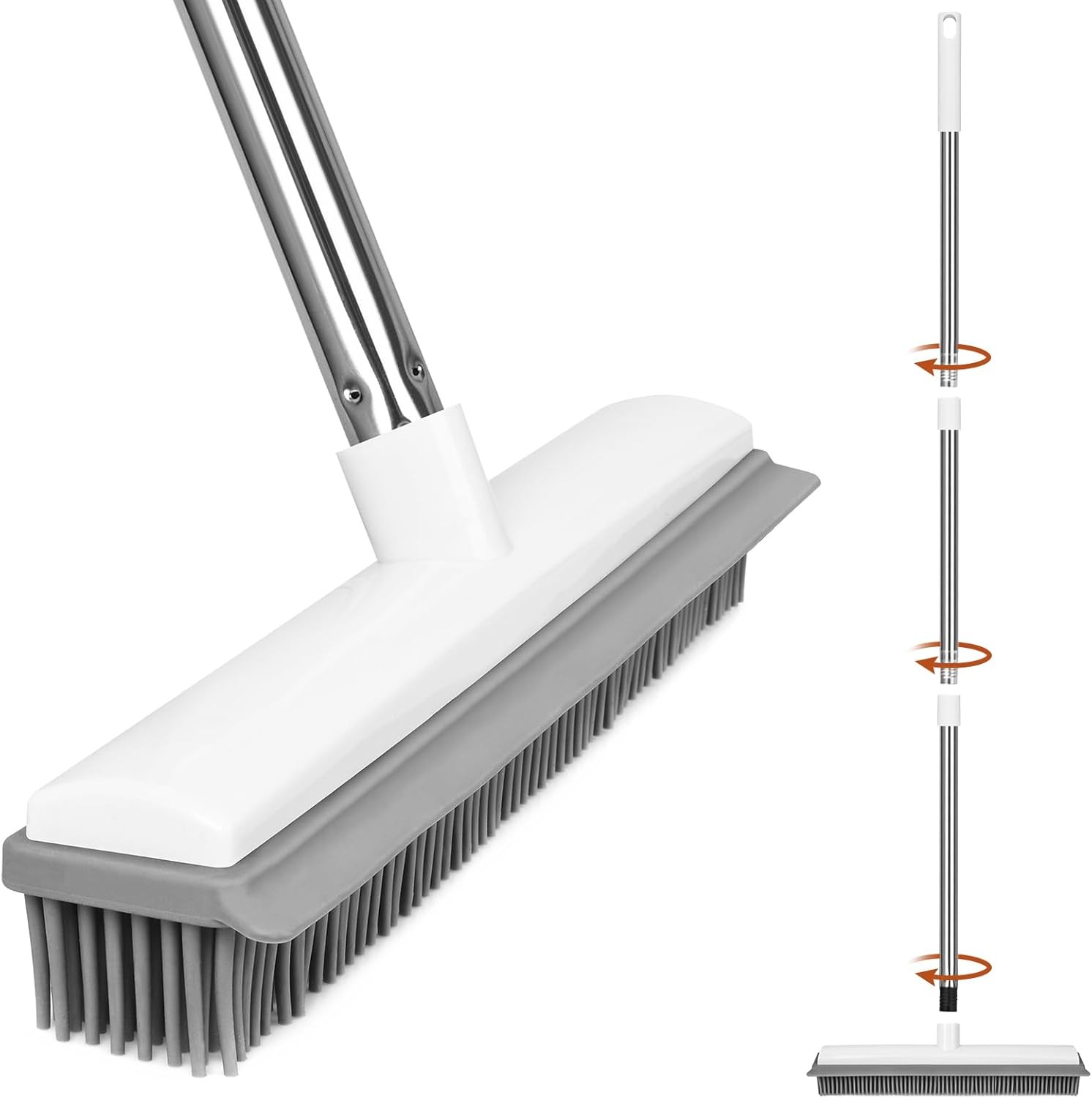 Rubber Broom, 2 in 1 Rubber Broom with Squeegee, Adjustable Long Handle Rubbers Brooms, Floor Scrubing Brush, for Pet Cat Dog Hair Removal Carpet Kitchen Garden Yard Window Cleaning,White