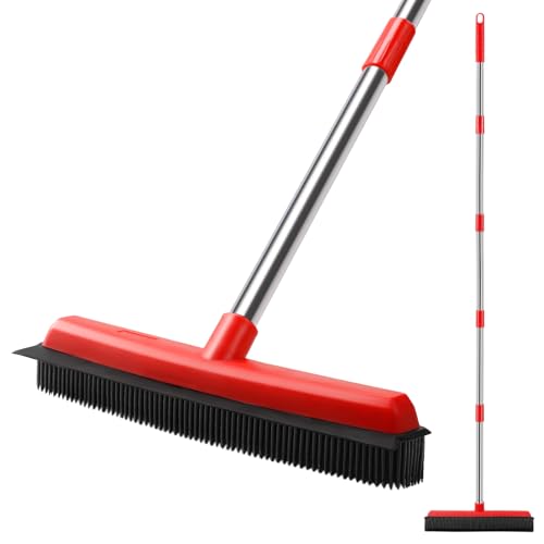 2 in 1 Rubber Broom with Squeegee Edge, Carpet Brush with Adjustable Long Handle