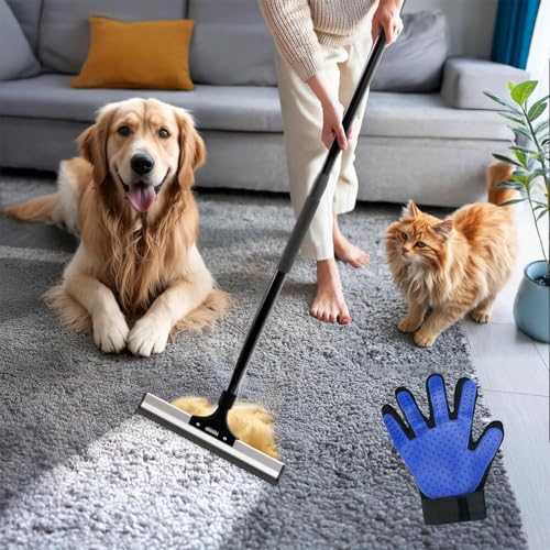 Carpet Rake for Pet Hair Removal with Long Handle, Dog Cat Fur Remover Brush Broom Scraper for Rug, Furniture, Couch, Car Mats, Stairs