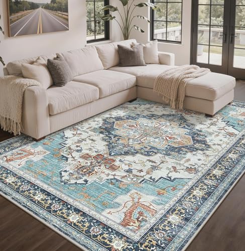GENIMO Rugs Living Room 160X230cm - Washable Large Rug No Pile Non-Slip Carpet,Durable Easy Clean Rug for Dining Room,Home Office (Cyan Blue)