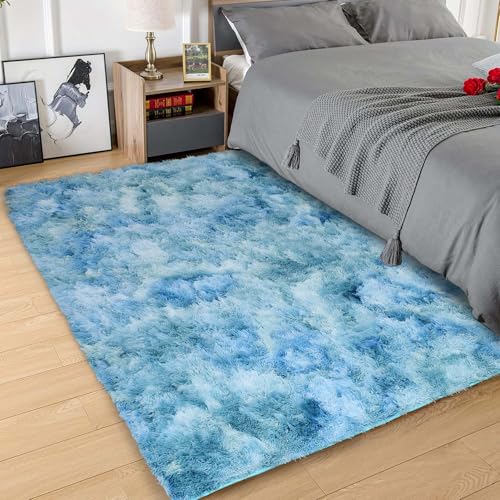Hafaa Fluffy Shaggy Rugs Living Room Tie-Dye Teal 80x150 cm, Non-Slip Carpet Runner Rugs for Hallway, Soft Thick Pile Bedside Rug for Kids Bedroom, Nursery - Non-Shedding