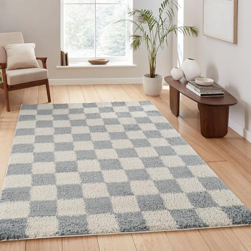 Chester Living Room Shaggy Area Rug Modern - Contemporary Checkered Design 30mm Plush Pile Jute Backing Soft Woven Carpet -Hallway Runner Indoor Rug, Grey, 120x170 cm