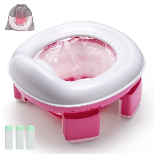 Warmiehomy Portable Travel Potty for Toddlers Kids Baby Foldable Potty Training Toilet Seat for 1-4 Years Boys Girls Indoor Outdoor Carry Potty Travel Toilet with 60pcs Cleaning Bags, Pink