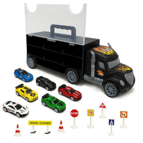 RANRHA Transporter Truck Carry Case with 6 Die-Cast Cars, Road Signs & Accessories – Toy Car Storage Carrier Playset for Kids Ages 3+