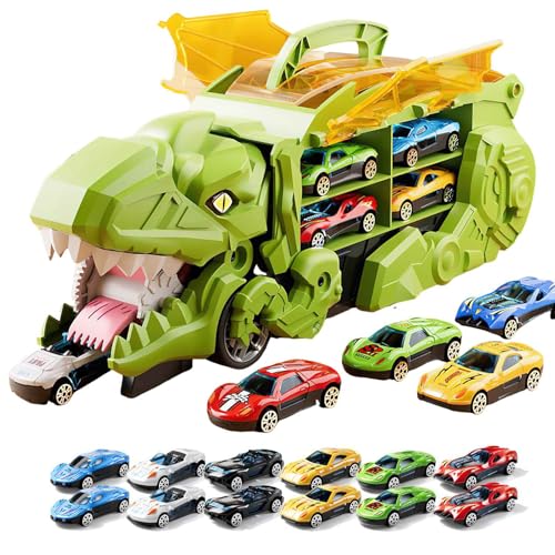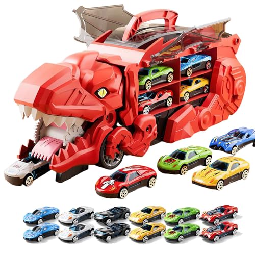 SHAWE Dinosaur Transporter Truck Toys for Boys Age 3-8, Portable Sliding Race Track Toy, 6 Racing Cars, Swallowing Action, Transformable Carrier Truck Car Toy Gifts for Kids 3 4 5 6 Years Old